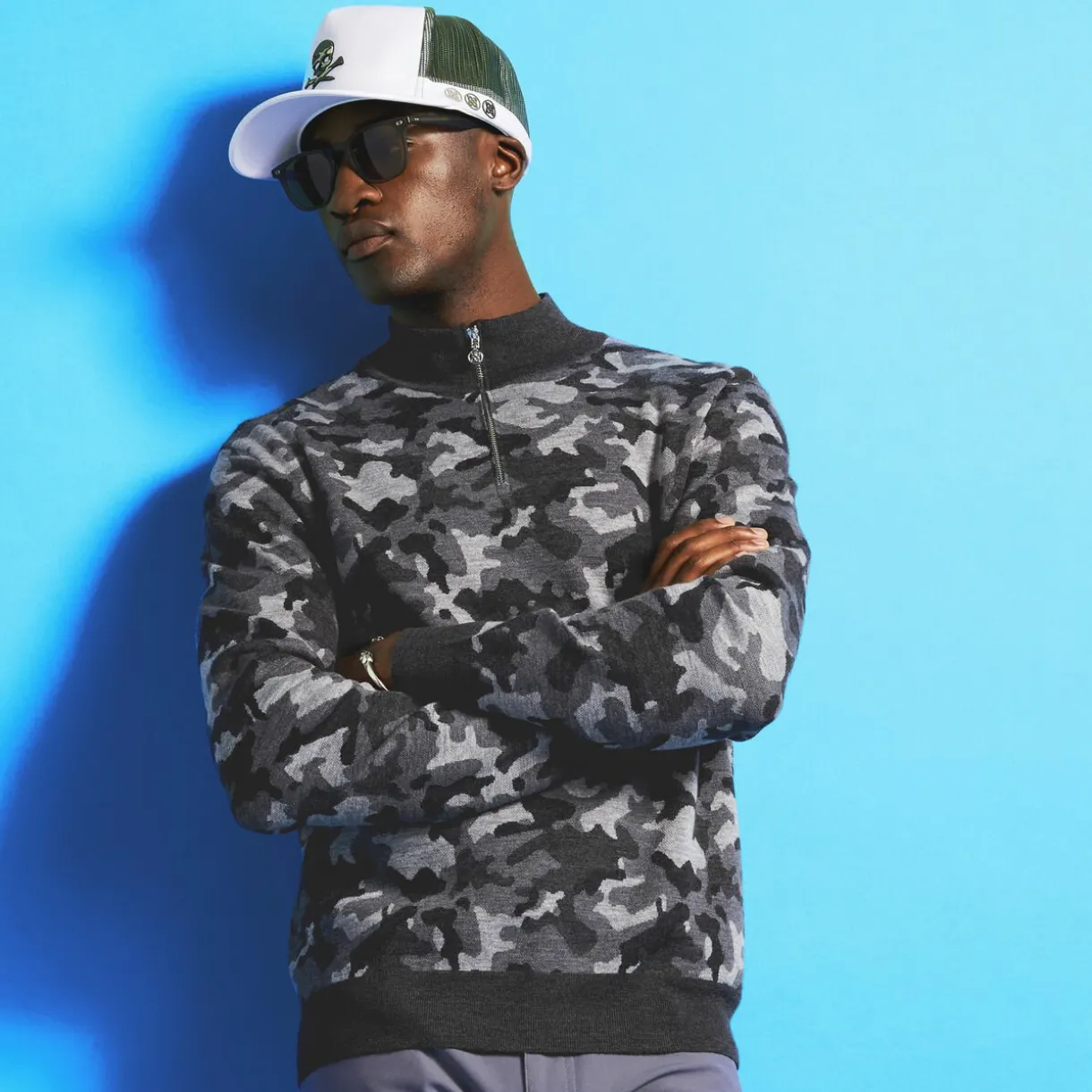 Made From Breathable Camo Jacquard Merino Wool, This Quarter Zip Sweater Is An Easy Layering Piece You Can Throw On Over A Polo Or Tee. Equipped With Moisture Wicking And Odor Inhibiting Properties, It Provides Just The Right Amount Of Warmth On Or Off The Course.