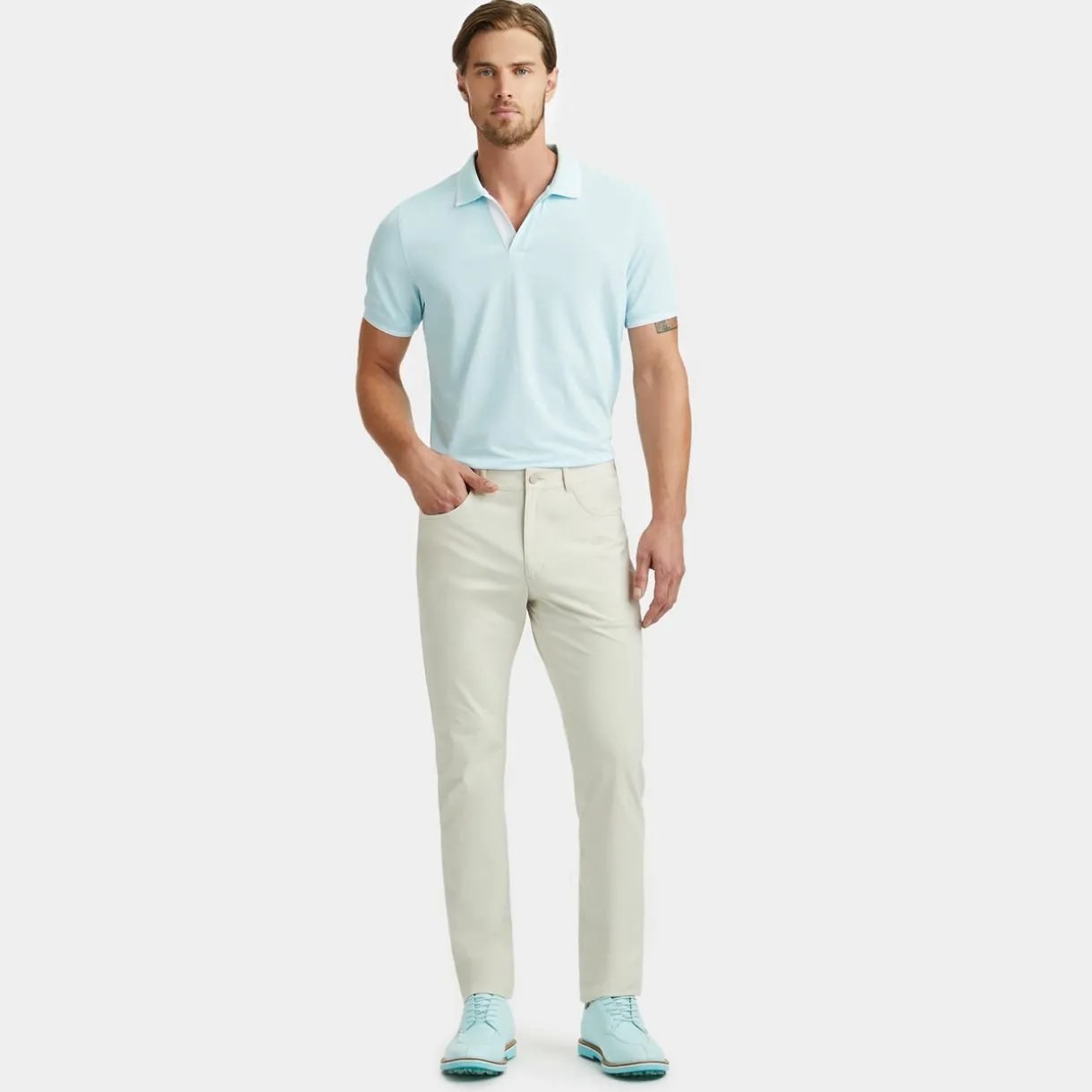 This Moisture Wicking Johnny Collar Tech Piqué Banded Sleeve Polo Is A Golfer’s Staple With Stretch And Versatility Des…